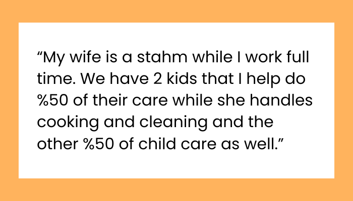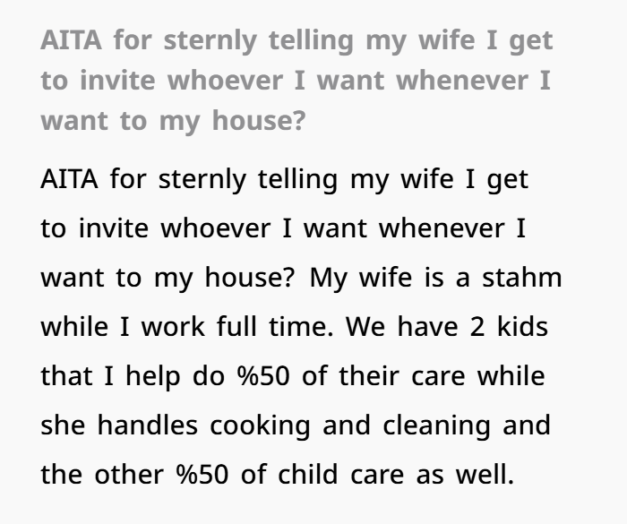 This story might seem like another “man vs wife doing all the work” situation, but it actually opens up a bunch of deeper issues — from mental load, emotional labor in relationships, household boundaries, SAHM expectations, to how to balance hospitality with respect for your partner.