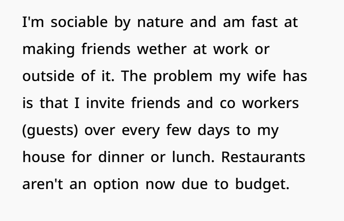 This husband, who works full time while his wife stays at home with their two kids, thought he was being generous by opening his doors to friends and co-workers for frequent meals. But the tension? It’s not the guests — it’s what comes with them. His wife is the one cooking, cleaning, setting up the table, serving drinks, and clearing everything once everyone’s gone. She never agreed to be the default host, and now, she’s reached her breaking point.