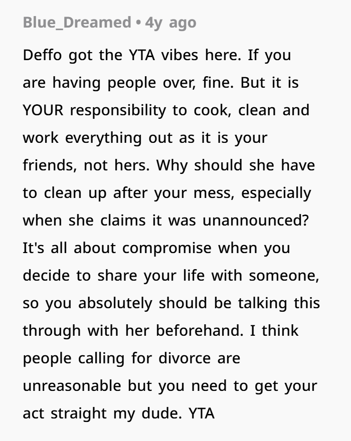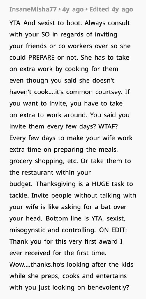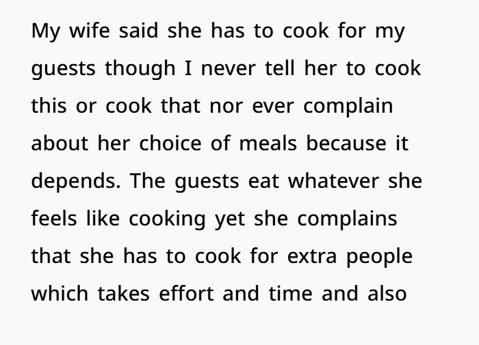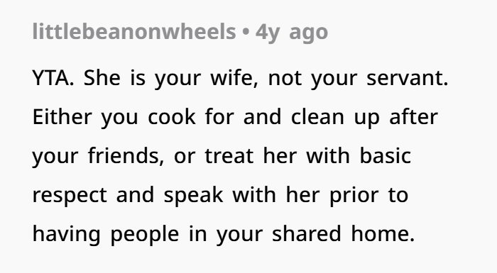 Many readers gave the author a reality check, noting that his wife isn’t obligated to cook for his guests