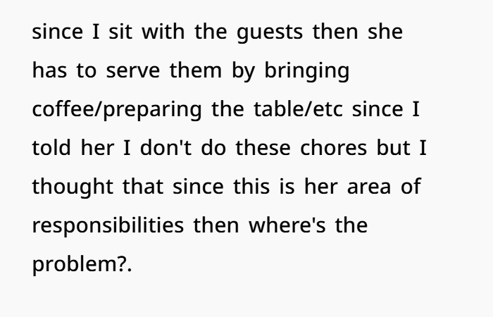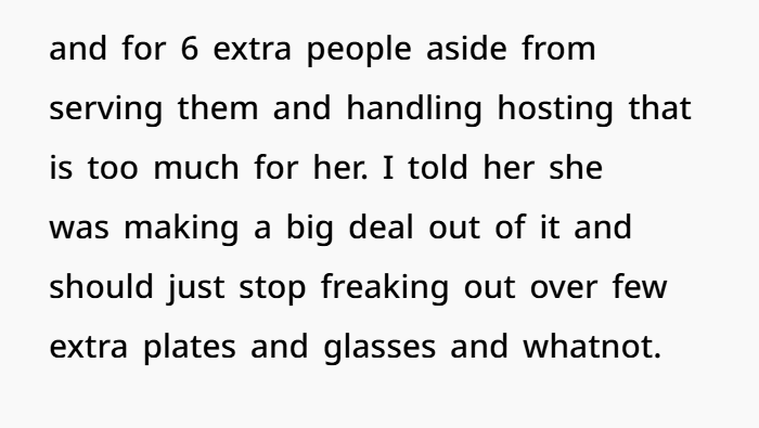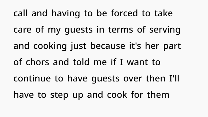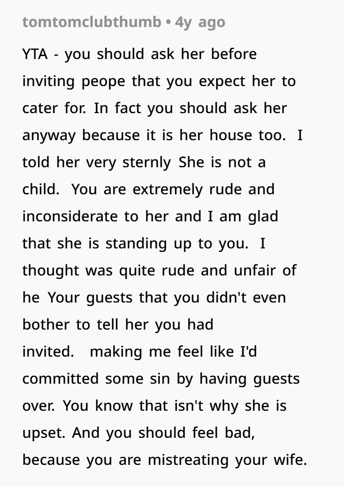 Even if he’s not explicitly saying “cook for them,” the expectation is baked in. And yeah, a spouse doesn’t need to ask for help directly for the pressure to be felt. Just knowing that people are coming — again — means she has to prep emotionally and physically.