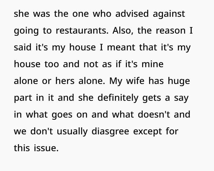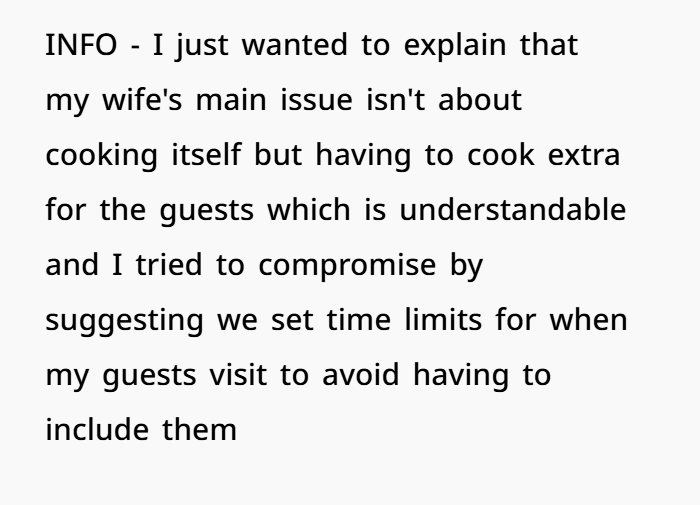 In his follow-up explanation, the OP says he offered to limit guest times or reduce visits. But his wife still said no. Why? Because it’s not just the time — it’s the principle.