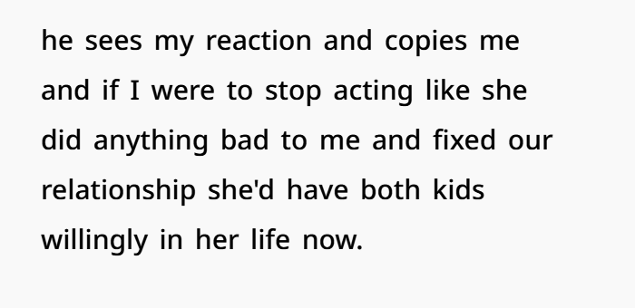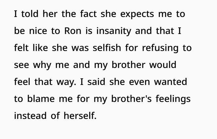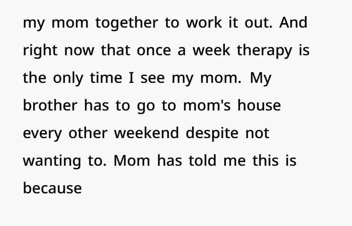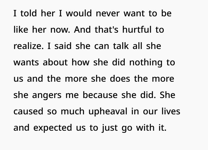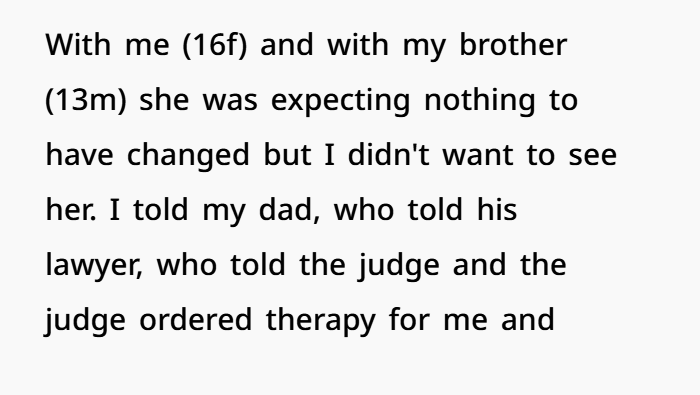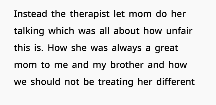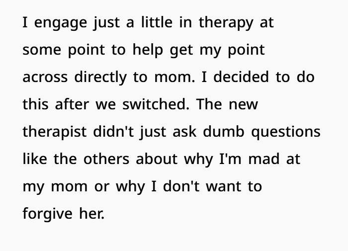 Her mom acted like things were normal, like OP should just adjust. But it doesn’t work like that. OP was hurt, angry, and couldn’t fake a relationship. So she pulled back, only attending mandatory therapy sessions. And even those didn’t help much, especially when her mom kept insisting she hadn’t done anything wrong as a parent.