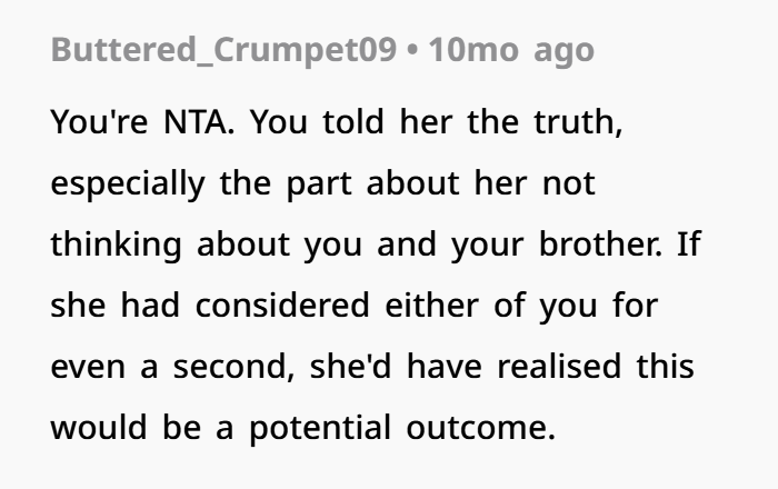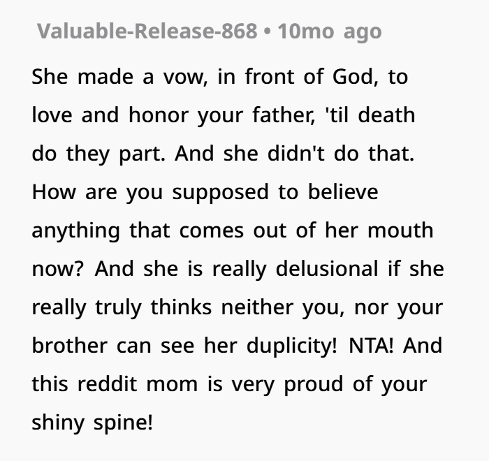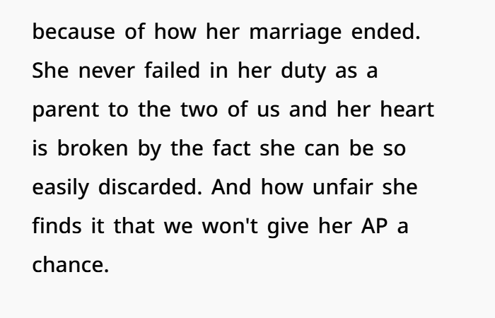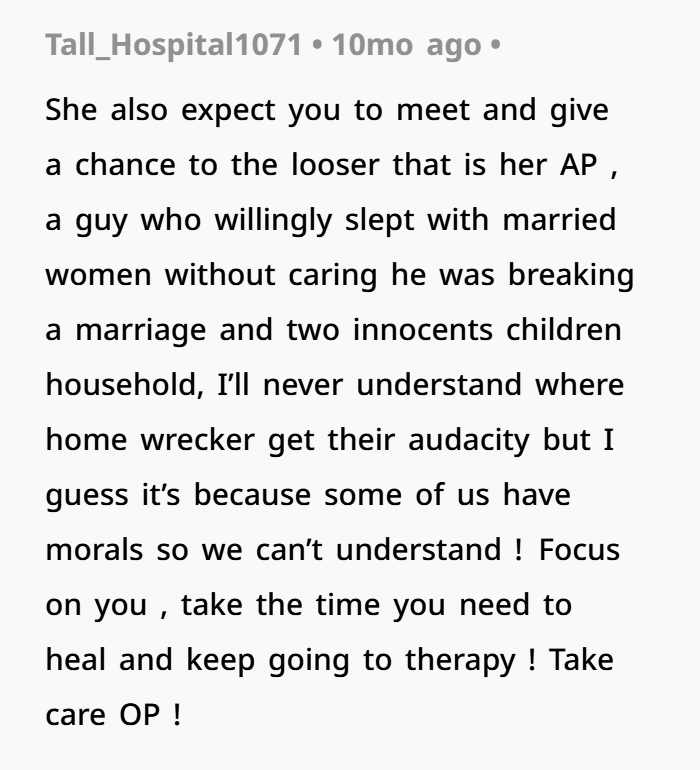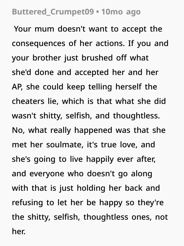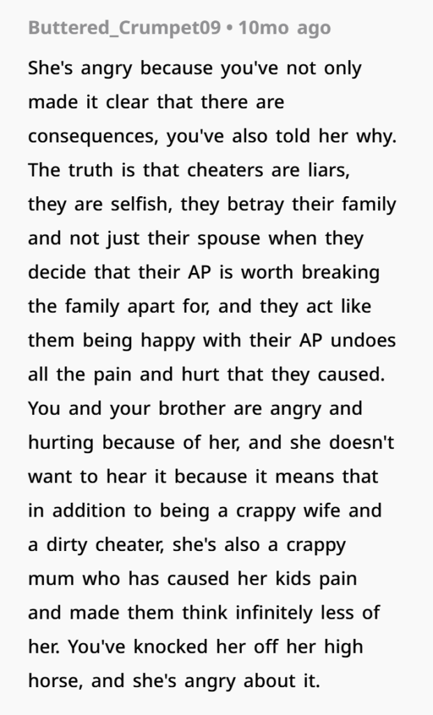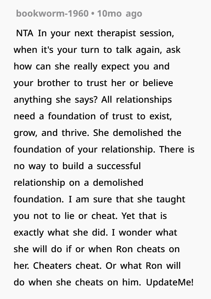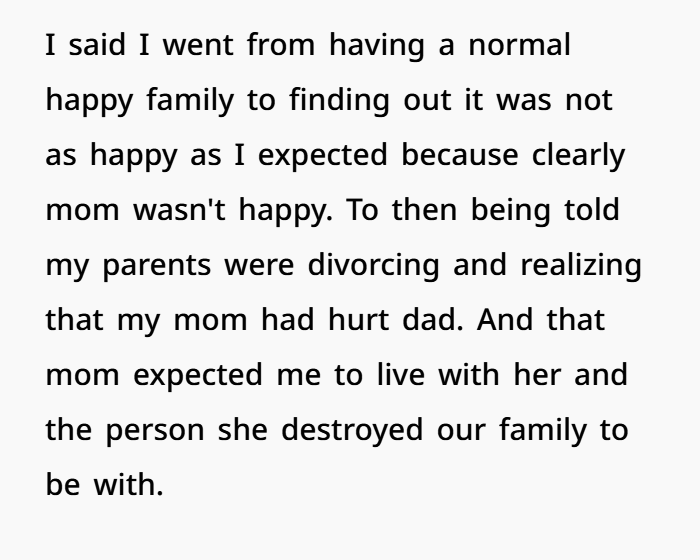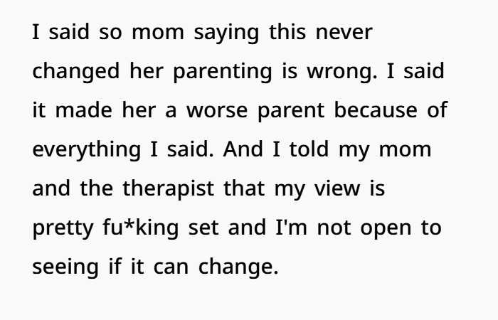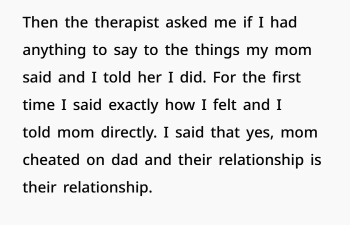 Then during a session with a new therapist, OP finally lets it all out. She explains how the affair changed everything, how it impacted her and her brother, and why she sees her mom differently now. And she says it clearly—her mom’s choices didn’t just break the marriage, they made her a worse parent. That’s a tough thing to hear, but it’s also something that comes up in emotional healing and family counseling dynamics. Now she’s stuck thinking… was that too harsh, or just honest?