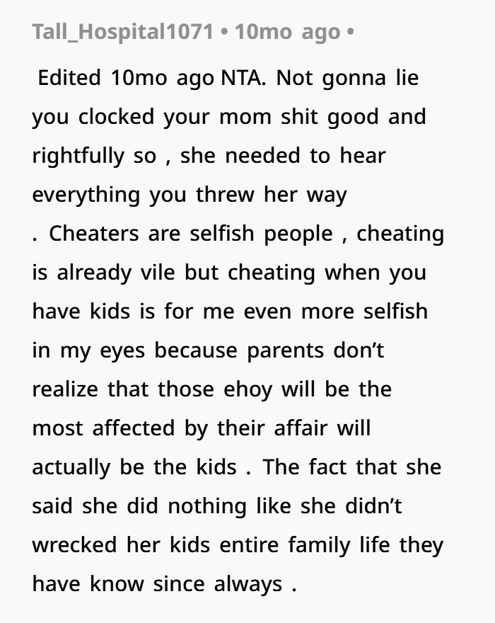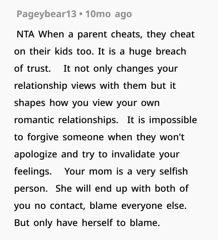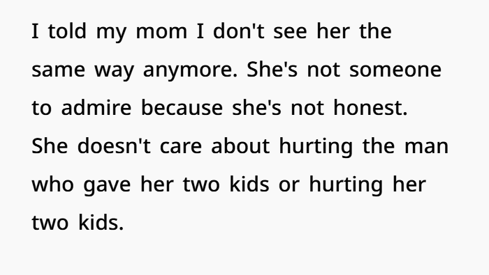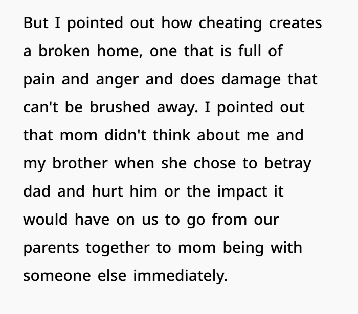 My Mom Says Her Cheating Didn’t Affect Us—I Disagreed. AITA?
