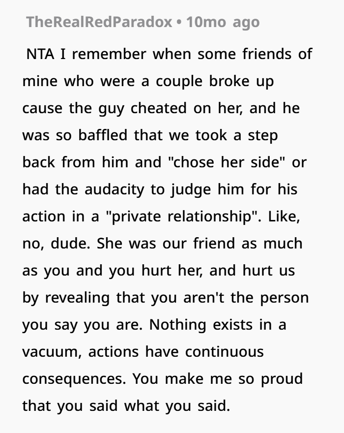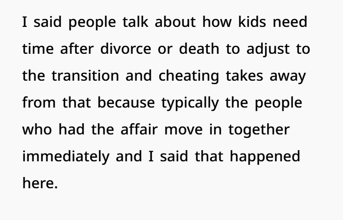This one is intense, because it goes way beyond just cheating. It shows how one decision can shake an entire family. The OP is only 16, and she watched her parents’ marriage fall apart after her mom had an affair and moved in with another man almost right away. No time to process, no slow transition—just instant change. That kind of emotional shock is huge, and it’s often talked about in adolescent therapy and family breakdown recovery.