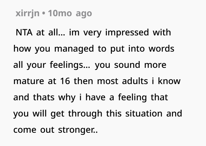 Also, you’re 16. You’re living through this right now, not reflecting on it years later. The emotions are still raw, things are still shifting, and you’re figuring it out as you go. Expecting you to handle all of this perfectly? That’s just not fair.
