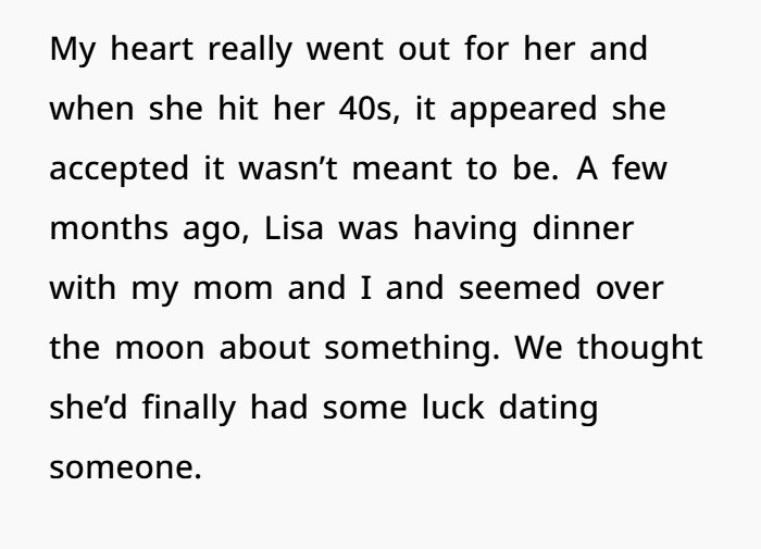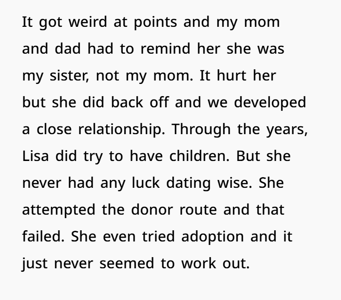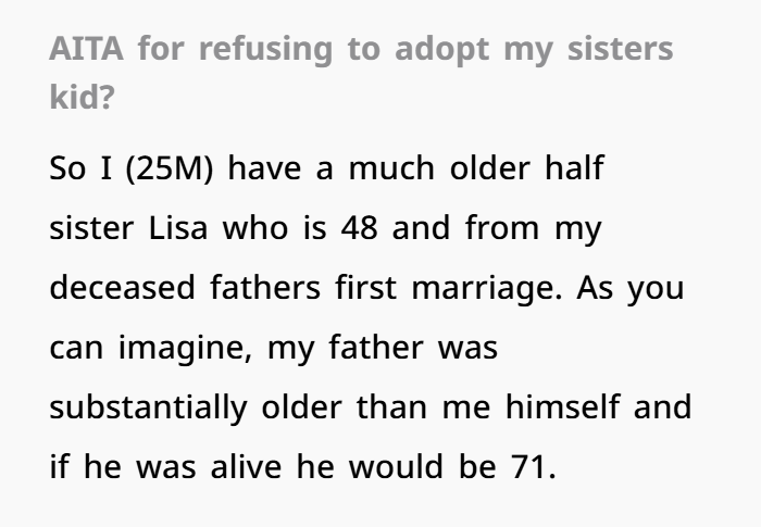 This story dives into a tough but all-too-real family dilemma — what happens when love for a sibling collides with the reality of long-term responsibility? OP (25M) shares a deeply personal situation involving his much older half-sister Lisa (48F), who, after years of infertility and heartbreak, is finally pregnant. But instead of this being a joyous new chapter, it quickly becomes a chaotic ask: Lisa wants OP to adopt the baby, take full financial and legal responsibility, while she still gets to “be involved.”