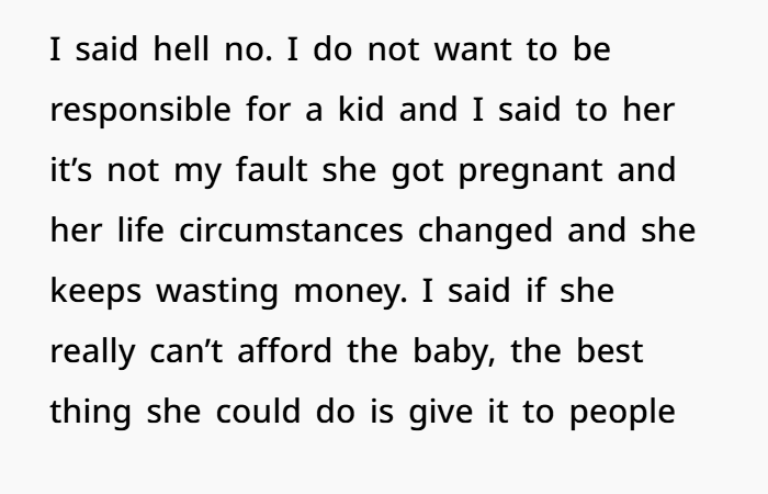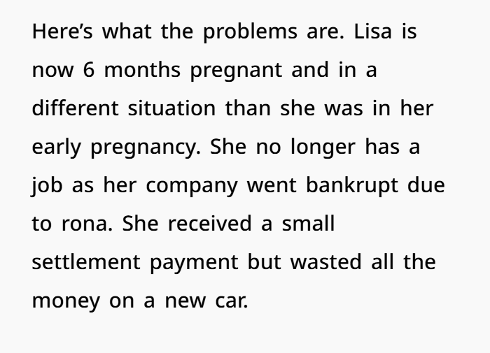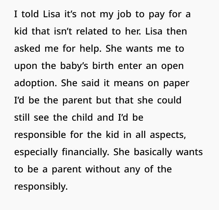 Lisa says OP’s “accusing her of being unfit” — but she’s literally proving it. She’s not financially stable. She’s not making smart choices. And she’s not even open to adoption by a loving family — just looking for a loophole to keep the baby without having to raise it.