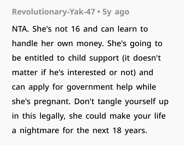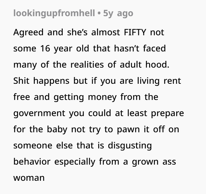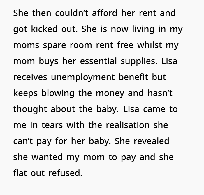 Big shoutout to OP’s mom here. She already accepted Lisa as a pseudo-sister despite the small age gap and complicated dynamic. She’s offering housing and essentials. She’s setting boundaries, too — refusing to financially support Lisa’s child long-term.