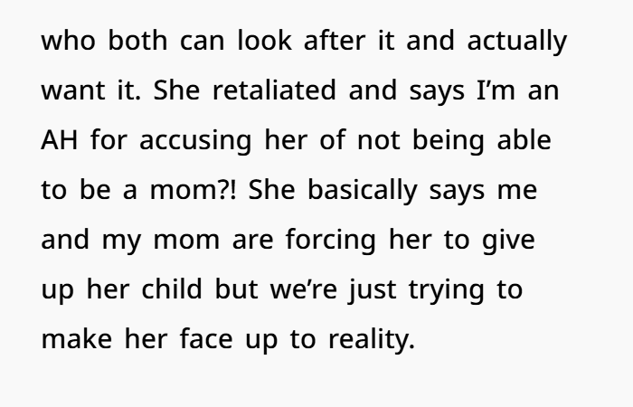 Lisa’s reaction — accusing OP of “forcing her” to give up her child — is emotional manipulation 101. She’s cornered and instead of facing the facts, she’s shifting blame. Classic guilt trip behavior.