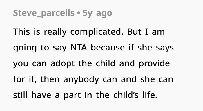 That’s not open adoption. That’s being a glorified babysitter with full financial burden. She basically wants OP to raise her kid while she plays auntie when it’s convenient. That’s not just unrealistic — it’s manipulative.