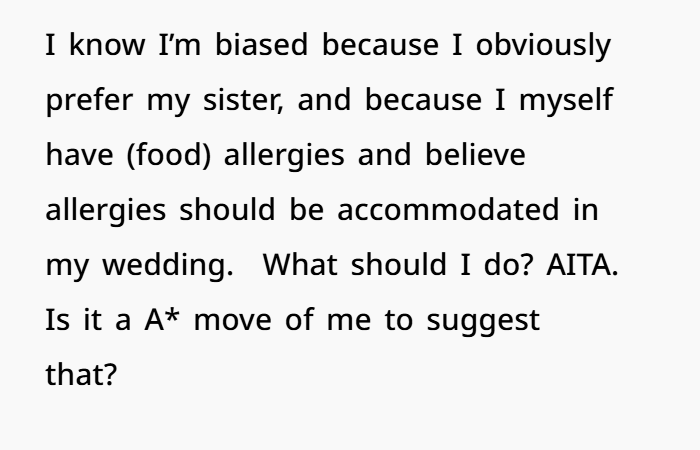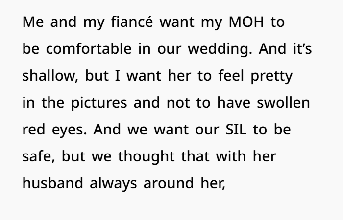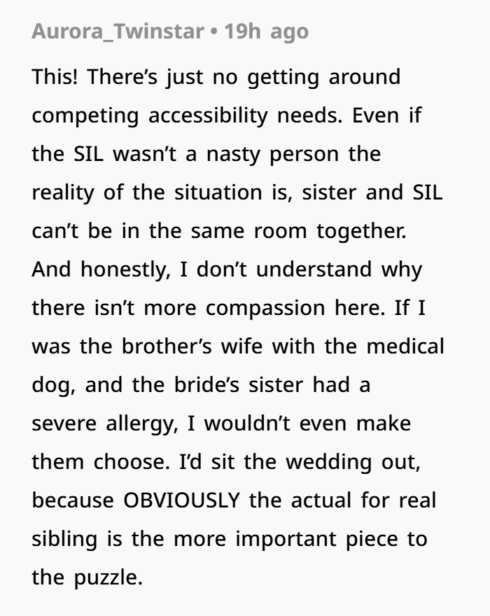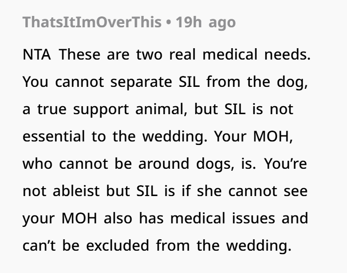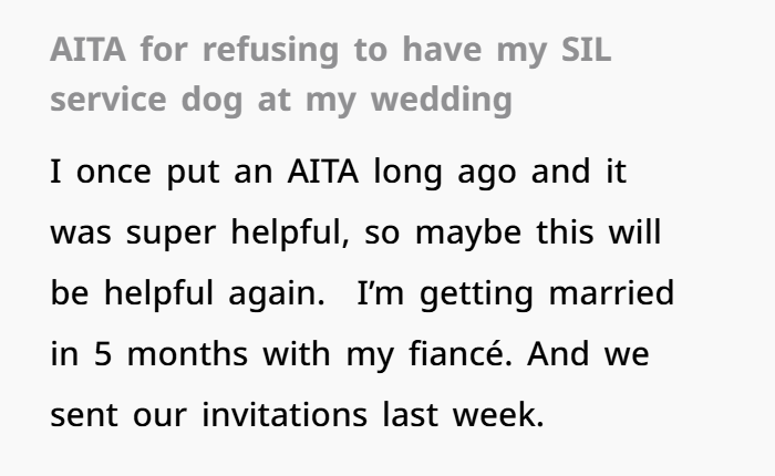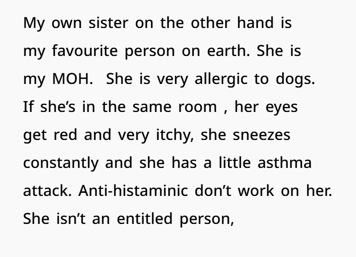 OP (the bride-to-be) is planning her wedding in five months and is facing a major emotional and logistical dilemma. Her sister, who she describes as her best friend and Maid of Honor, has a severe allergy to dogs — we’re talking asthma attacks, red swollen eyes, nonstop sneezing, and no relief from antihistamines. On the other side? Her sister-in-law (SIL), who has a medical service dog trained to detect seizures caused by a brain tumor she survived years ago.
