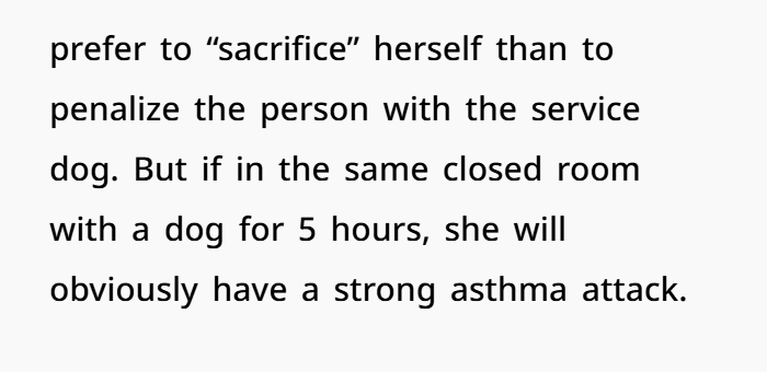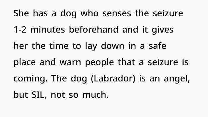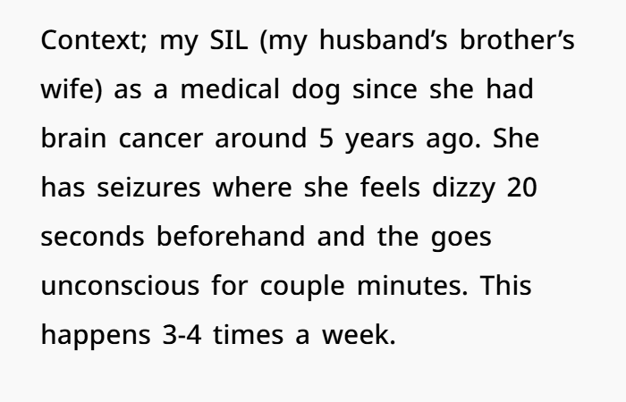 So when OP asked SIL to leave her dog at home — even with extra human support — SIL probably felt like she was being asked to go without her own life-saving tool. And to be fair, from a disability rights perspective, that can definitely feel discriminatory. Especially if the dog is medically necessary, not just for “comfort” or emotional support.
