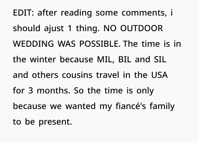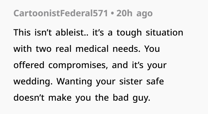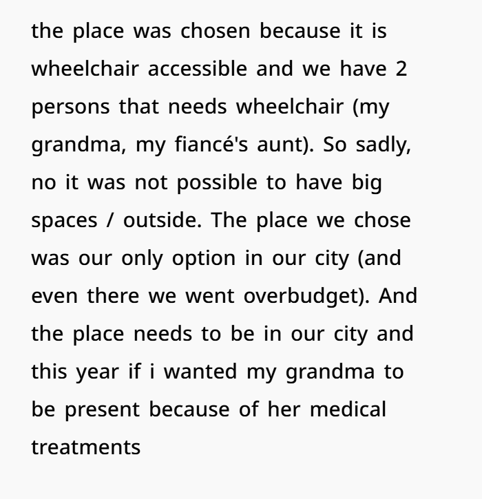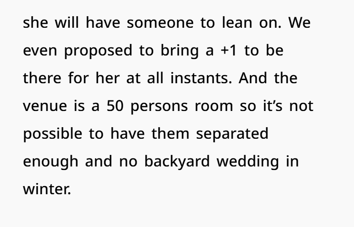 Some commenters might say: “Just separate them!” or “Put them in different rooms!” But OP explains the venue is small, indoors, and the wedding is in winter. No option for outdoor separation. No budget for a bigger place. Plus, two wheelchair users (grandma and an aunt) limited the venue options even more.