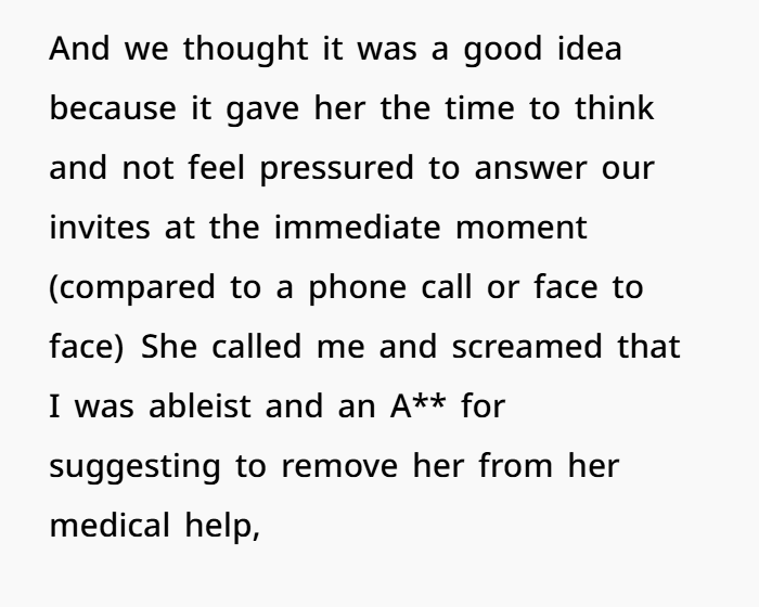 Could the message have been delivered better? Sure. A face-to-face talk would’ve avoided the shock factor. Could she have added more empathy? Absolutely. But at the end of the day, asking someone to compromise for one day isn’t the same as being ableist.