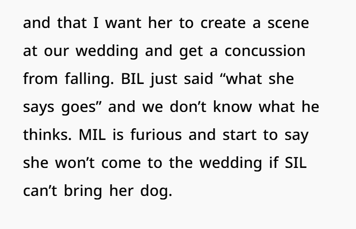 SIL’s dog is a legitimate seizure alert service animal, crucial to her safety since she has several seizures a week and needs time to lay down and alert others. The issue? OP and her fiancé are holding their wedding in a small, indoor 50-person venue in winter, with no outdoor or larger-space option. They tried to compromise: proposing SIL bring an extra support person and have her husband on standby, while leaving the dog at home for just one day. But SIL exploded, calling OP ableist and threatening drama. Now, OP’s MIL is threatening not to come at all, and the whole family is taking sides.