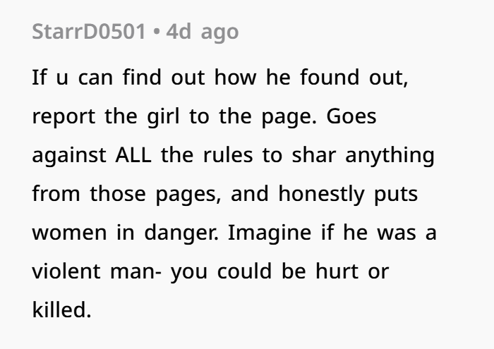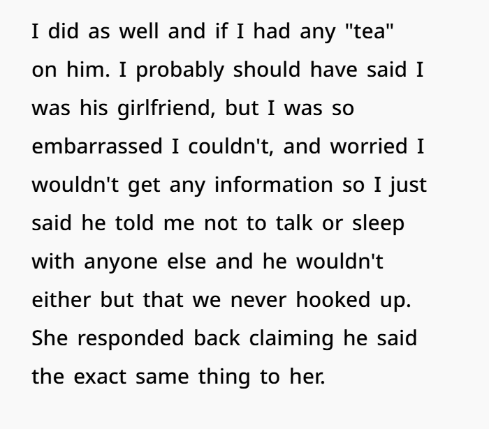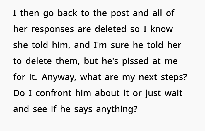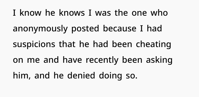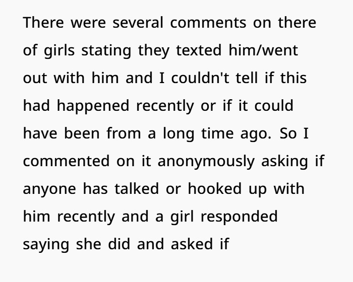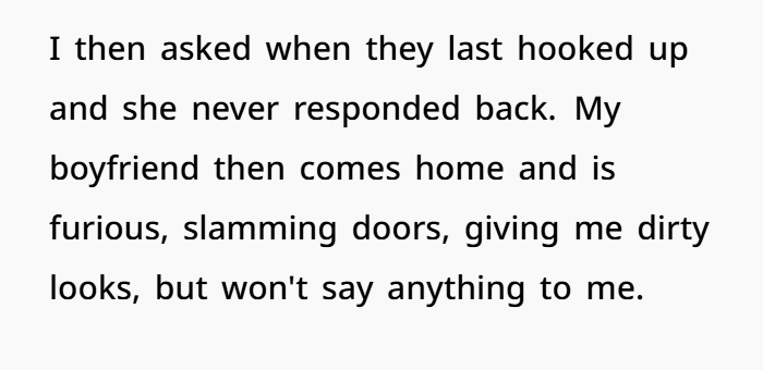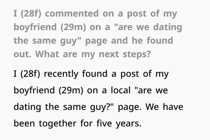 You (28F) discovered a post on a “are we dating the same guy?”‑type page about your boyfriend (29M). You’ve been with him five years. The post had comments from women claiming they’d texted or met him. Thinking you needed to know what was going on, you anonymously asked if anyone had hooked up with him recently. One girl responded, implied yes, and said he told her the same thing he told you: no hooking up, only you. Then the replies got deleted, you suspect your boyfriend got wind of things, and now he’s furious, silent, giving dirty looks—with no conversation. And you’re stuck: same lease, same apartment, big relationship.
