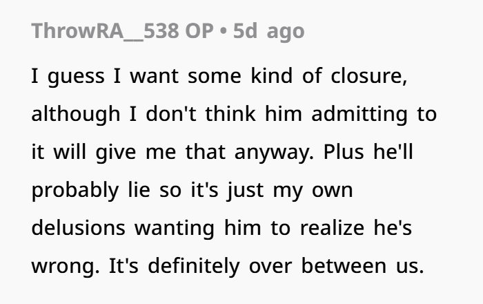 If trust is broken, rebuilding requires both sides. According to therapeutic sources, it’s not only about them proving they’re trustworthy, but about you deciding what you need, and whether you’re willing to stay if things don’t change. Mindfully Minding Me Therapy+1 Also, if you keep spying/commenting anonymously, that can worsen trust issues. ryananswers.com