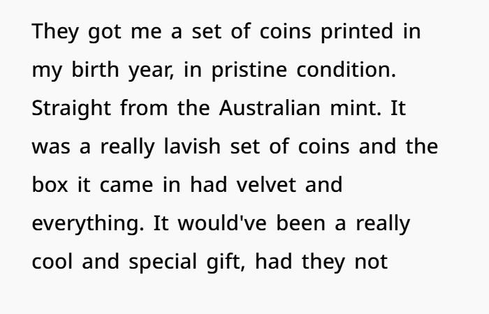 Then came the big gift from my parents, the one they hyped up for days. A minted coin set from the year I was born, in pristine condition, encased in velvet — sounds fancy, right? But here’s the thing: they gave my brother the exact same gift for his 18th birthday three years ago. He loves coins. He collects them, polishes them, tracks limited editions. It fits him. But it fits me how? I’ve never cared about coins.