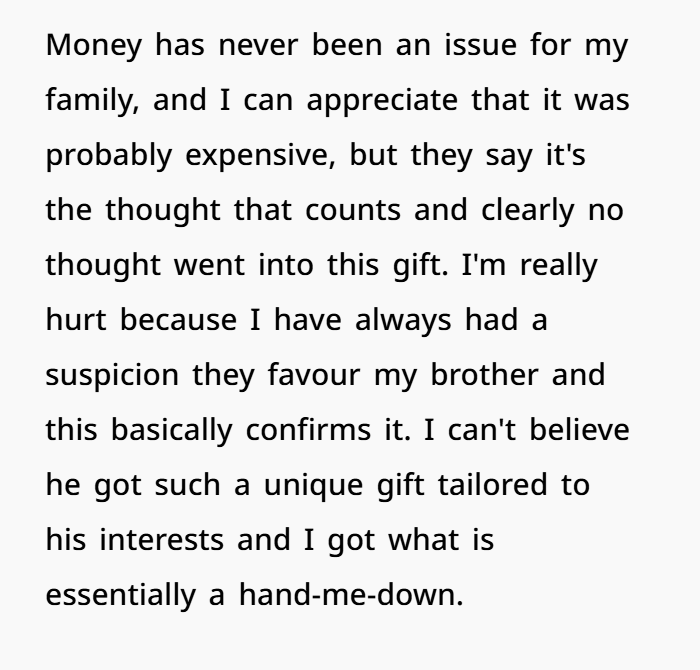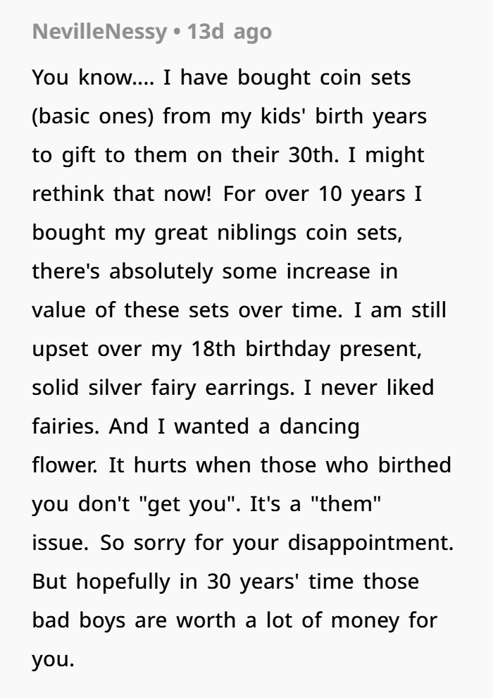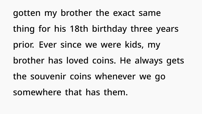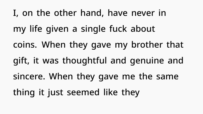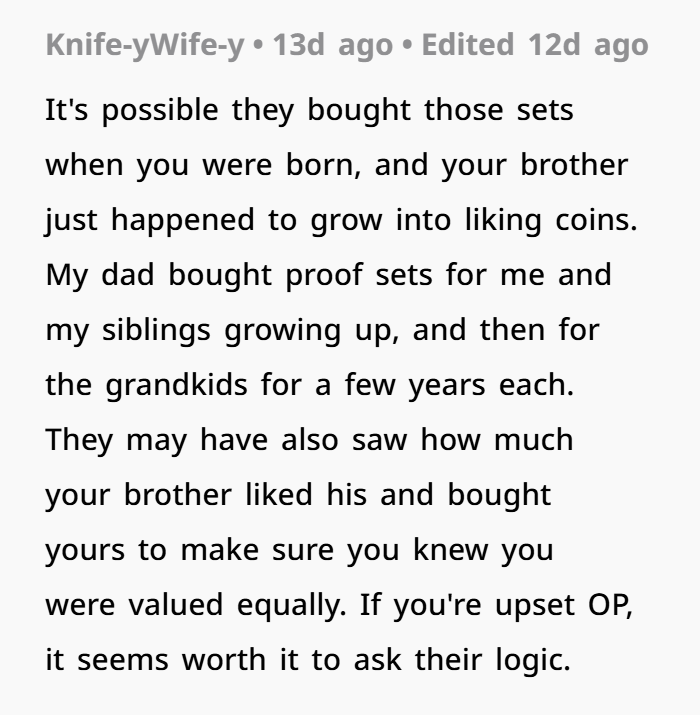 At its heart, your pain comes from feeling unseen. Gifts often carry symbolic weight: they show that someone paid attention to you — your likes, your dreams, your quirks. When your parents gave your brother that coin set, it likely spoke to him; when they gave you the same, it screams of a lack of differentiation.