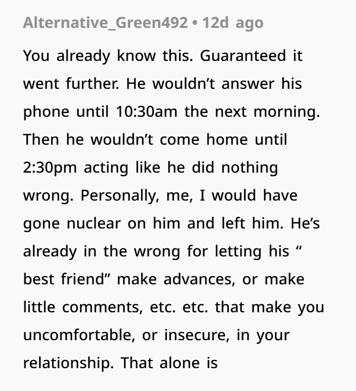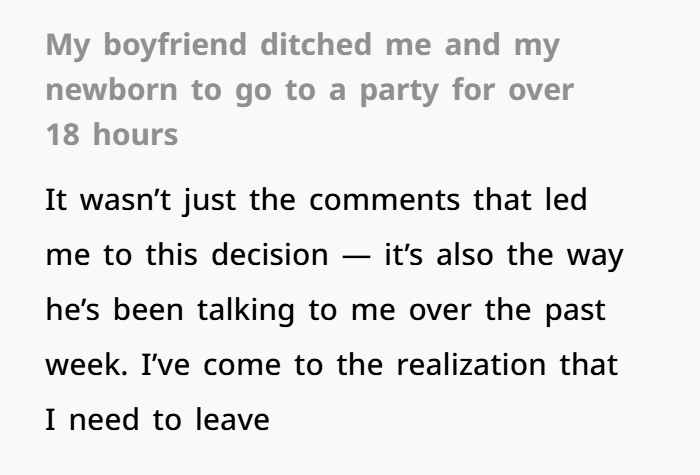 You’re hurting — and honestly, I get why. Your boyfriend went to a party, left you with a newborn, and didn’t come home for more than 18 hours. You were up all night, scared, worried, and alone. When someone you love ignores your texts, shows up with a casual “hey babe,” and then gives a lousy excuse, it’s not just careless — it’s disrespectful. This wasn’t just a bad night. It’s part of a pattern of him talking down to you, muttering insults, and making you feel like second choice. After everything you’ve typed out, your gut has spoken: you don’t feel loved, respected, or safe in this relationship.