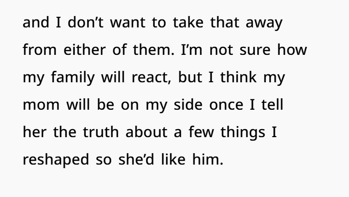 You mentioned wanting your mom to like him — and that’s normal. We all want our family to approve of our partner. But you said you reshaped the truth so she’d like him. That’s a red flag in itself.