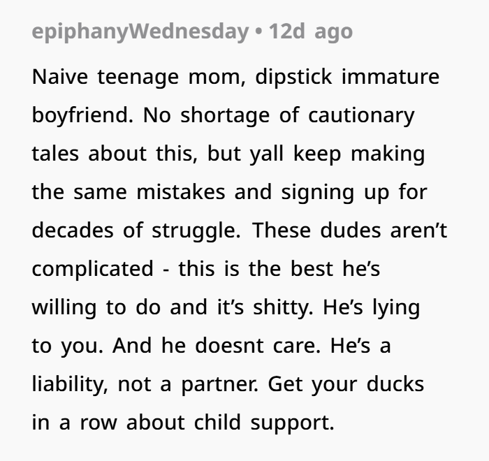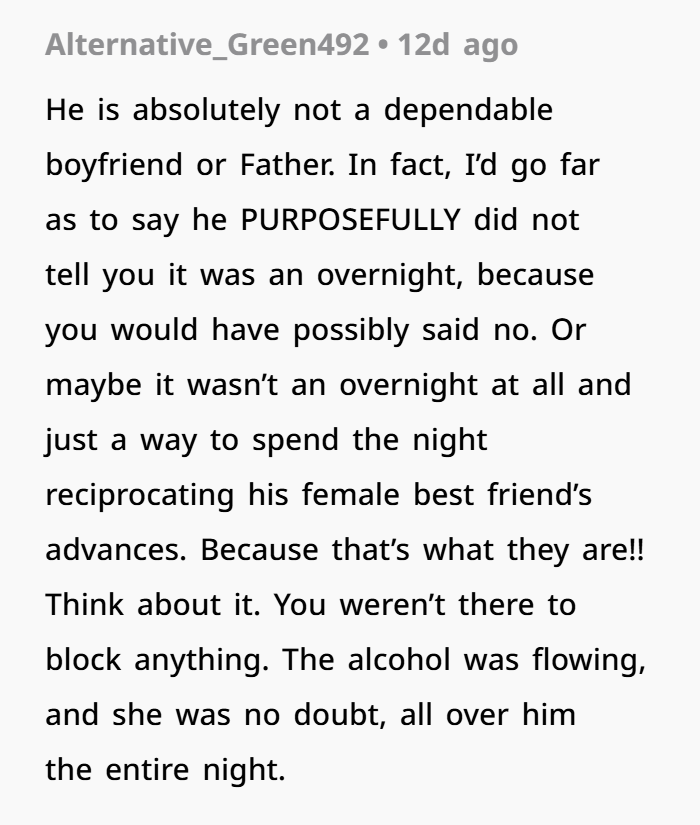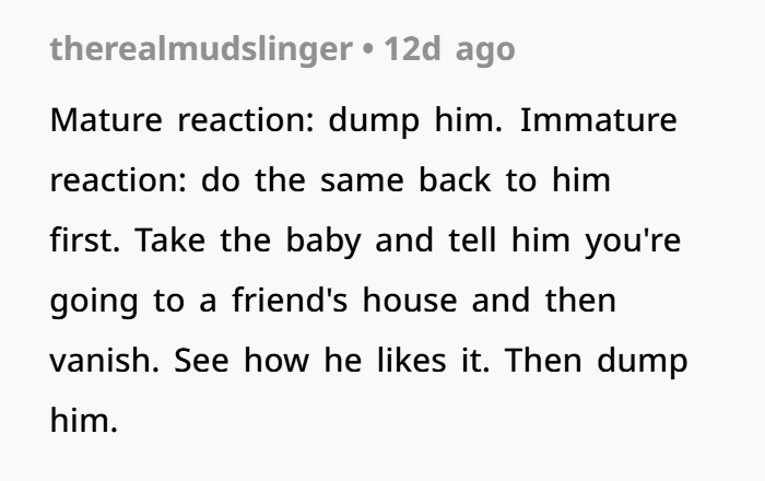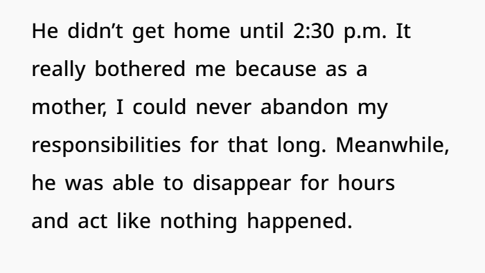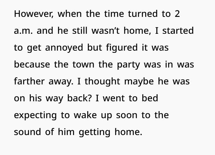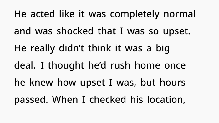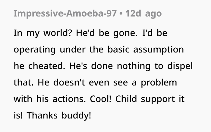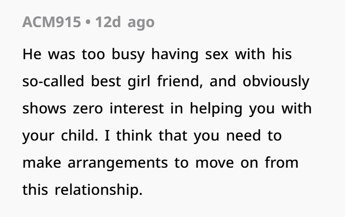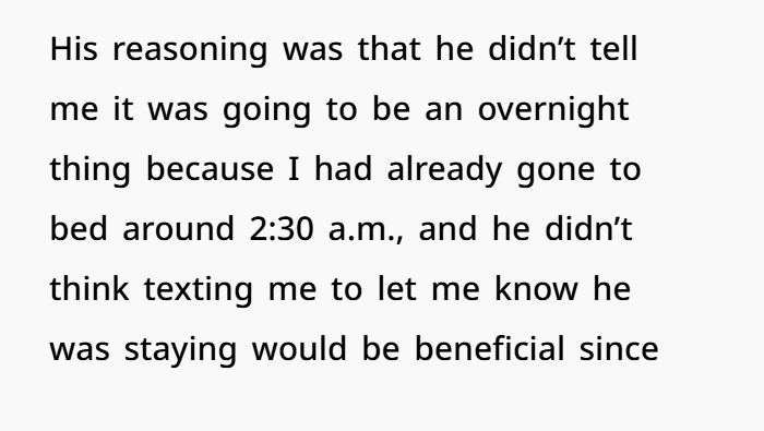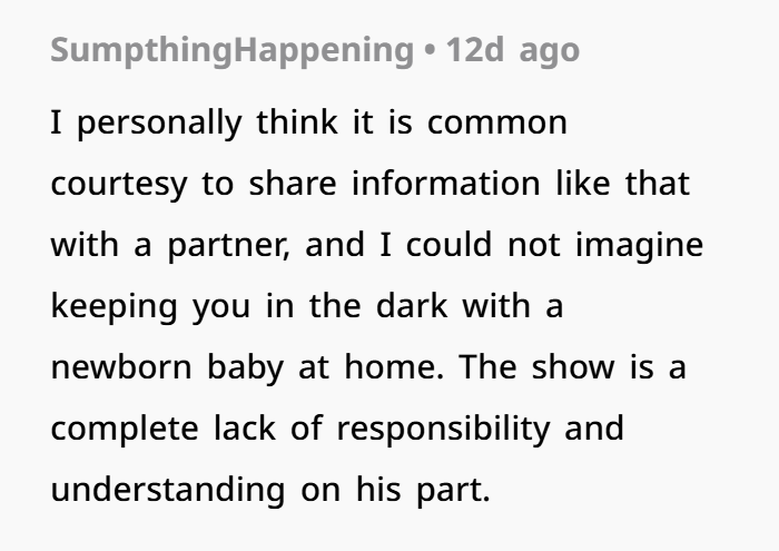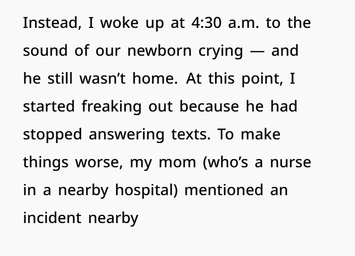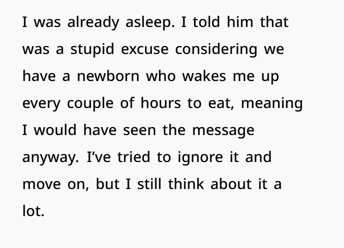 His excuse — “I didn’t think texting you would matter since you were asleep” — is one of the weakest justifications I’ve ever heard. Especially when there’s a newborn involved. You wake up for feedings, diaper changes, everything. You would’ve seen that text.