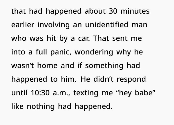 And then when he did respond, it was like your fear didn’t matter. Saying “hey babe” after you were up all night worried is dismissive. That’s not love. That’s not partnership. That’s disregard.