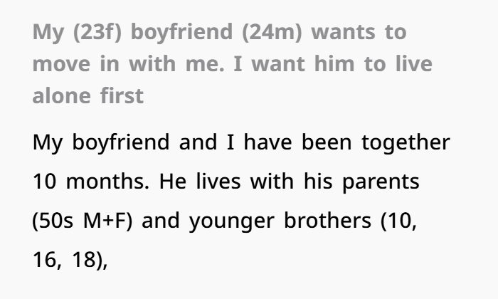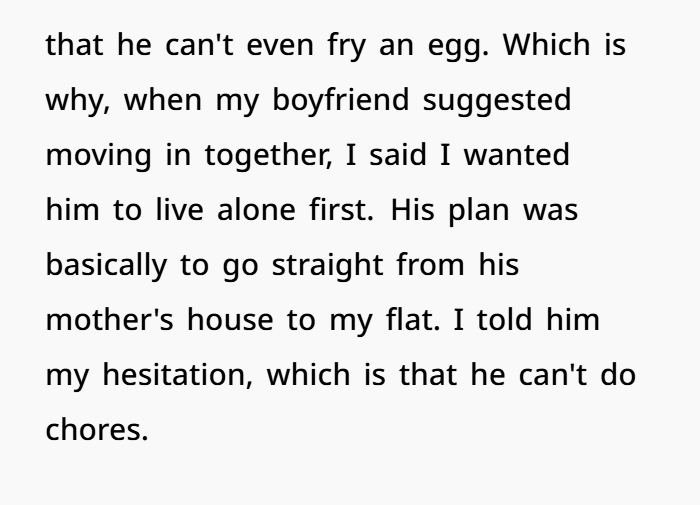 OP’s request for him to live alone before moving in together isn’t some power play. It’s a practical test.