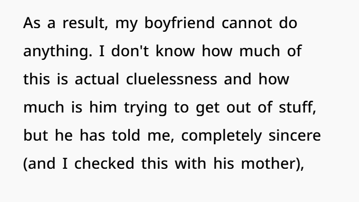 In this case, the boyfriend was literally raised to be dependent. That’s not his fault, but it is his responsibility to unlearn.