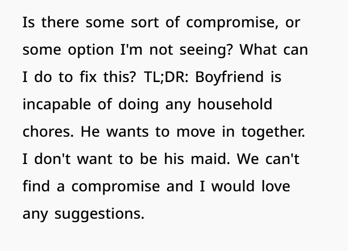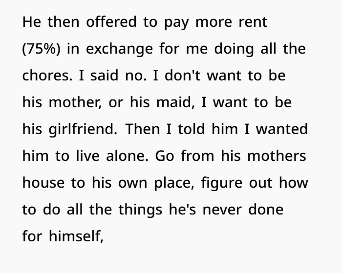 Let’s start here. His offer to pay 75% of rent if OP handles 100% of the chores isn’t a compromise—it’s a red flag.