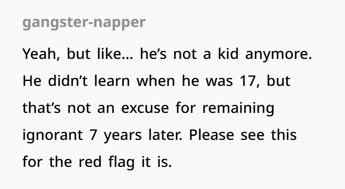 - Stand firm. It’s tempting to give in, but OP’s boundary is legitimate. If he refuses to engage or grow, that tells her more than any argument ever could.