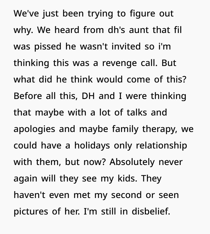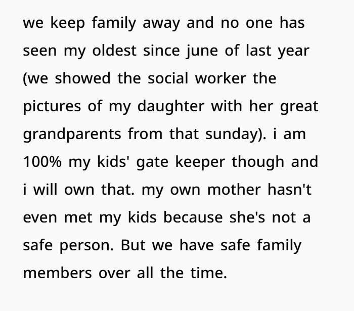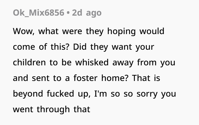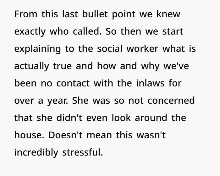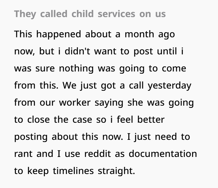 But as we walked her through our reality — the no-contact boundaries with in-laws, the truth about our home, the care we give our kids — she didn’t seem alarmed. She didn’t look around our home in depth. Eventually, the worker told us she’d close the case. Tomorrow I’m calmer enough to post this. I don’t know what I expected — maybe validation, maybe justice, maybe some apology. Instead, I just want to document that we survived this, that we were deeply shaken, and that I will never allow those people near my kids again.