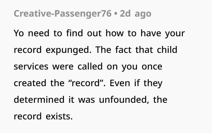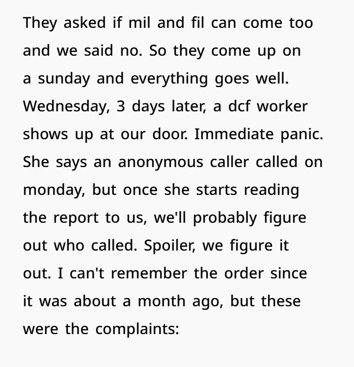 Soon after the poster’s husband’s grandparents and aunt came to visit their newborn, the couple found CPS on their doorstep