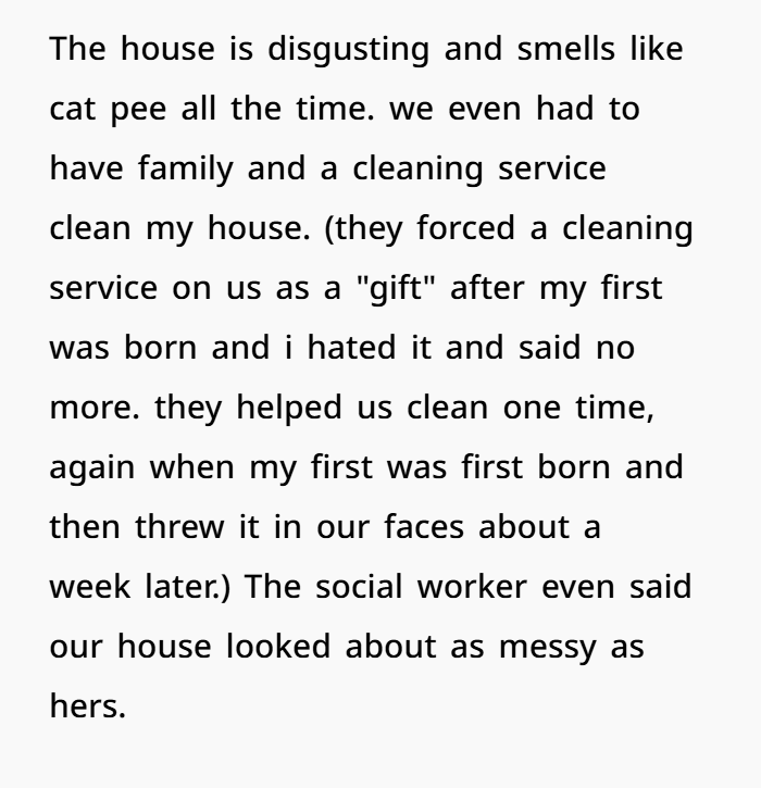 About a month ago, a social worker knocked on our door because someone had anonymously called child services on us. The complaint was wild — that my husband was an alcoholic and daily weed user, that I was so depressed I couldn’t get out of bed, that our house reeked of cat pee, that my sister lived with us, and that we keep “family away” (i.e. no contact with in-laws). We were in immediate panic — we know how these things can spiral.