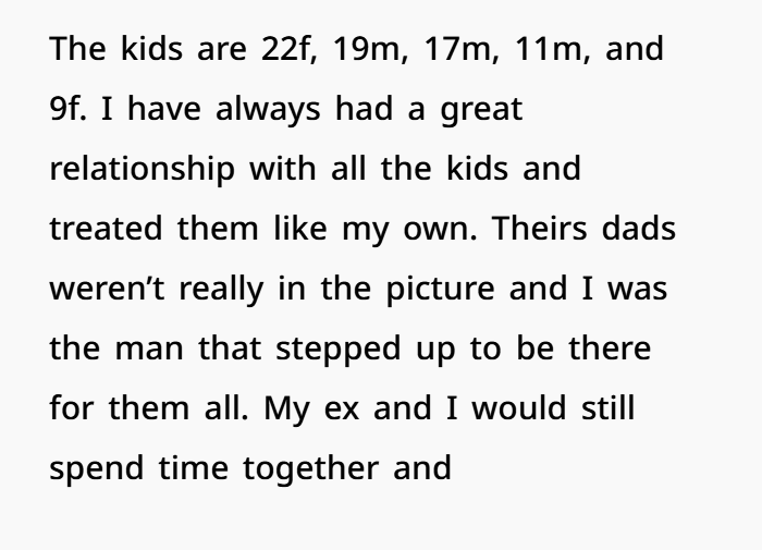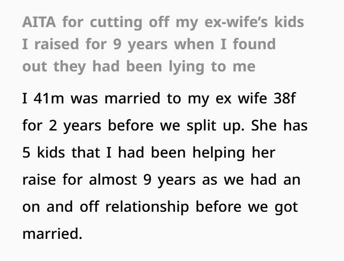 Let me start by saying this isn’t easy for me to talk about, but I’m looking for some perspective on whether I made the right choice or if I was too harsh. I’m 41, and I was married to my ex-wife, who’s 38, for about two years. Before that, we had a pretty complicated, on-and-off relationship for almost nine years. During that time, I helped raise her five kids, who were 22, 19, 17, 11, and 9 when we split. I stepped in as a father figure, especially since their biological fathers weren’t involved. I treated them like my own, and we had a pretty solid relationship.