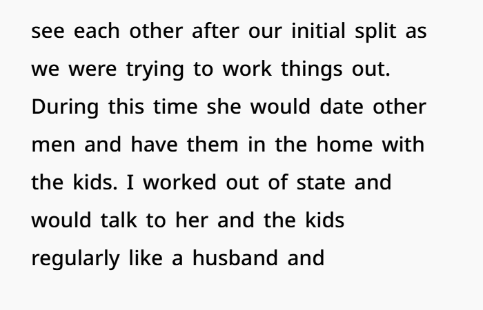Even after the divorce, my ex and I still spent time together, trying to figure things out. During that time, she dated other guys, and the kids would often be around. I worked out of state for my job, so when I had time off, I’d spend it with them, keeping in touch with both my ex and the kids. But, as you might guess, there was a lot more happening behind the scenes that I didn’t know about.
