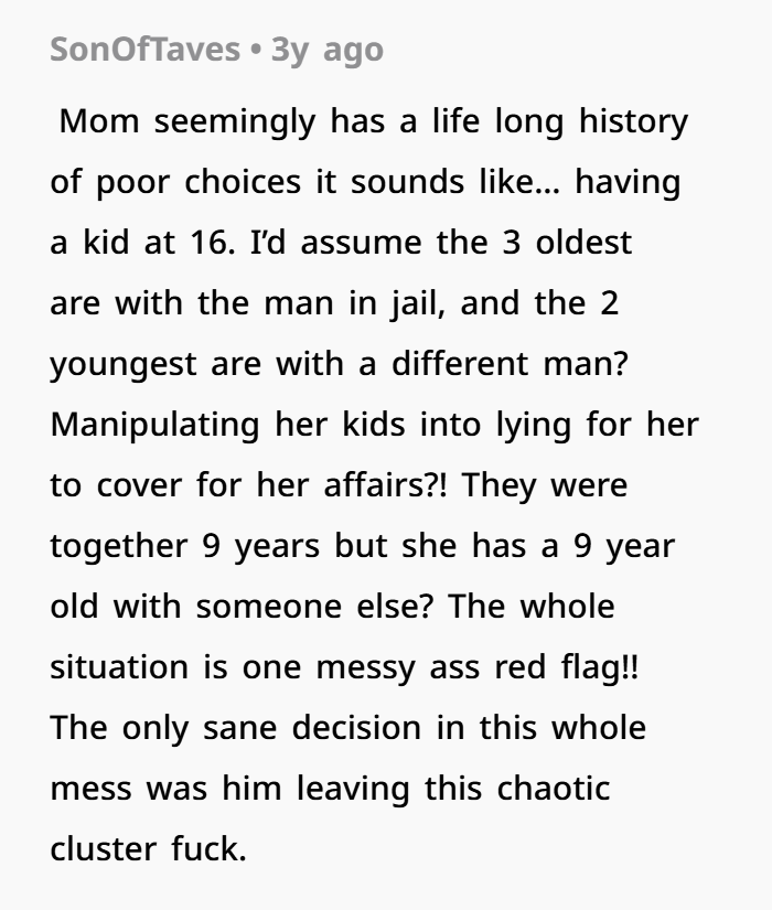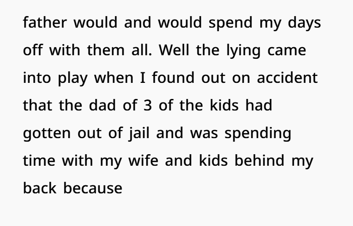 The whole situation came crashing down when I found out, completely by accident, that the biological father of three of my ex’s kids had just gotten out of jail and was spending time with her and the kids while I wasn’t around. I wasn’t supposed to find out, but eventually, the truth came out. Apparently, they’d all been hiding this from me for a while, including covering for my ex’s behavior during our time together. I had always believed I was the one supporting them—paying bills, taking care of things at home, being the father figure. But when I found out the truth, it hit me hard.