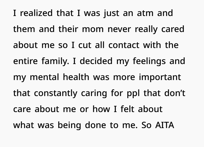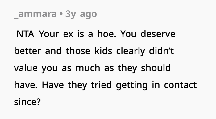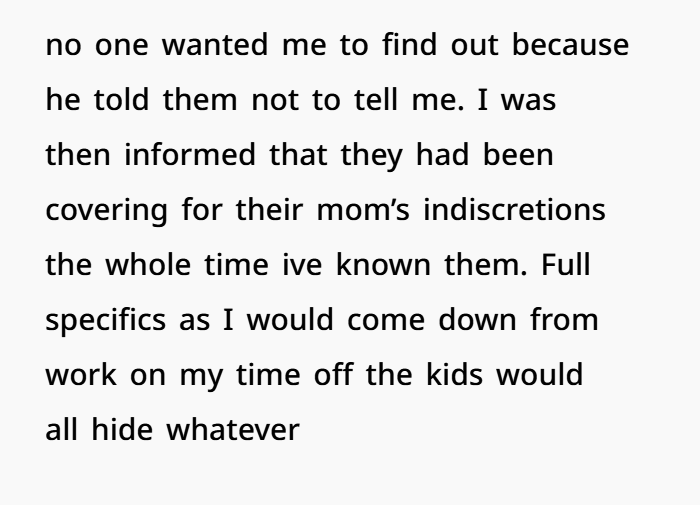 So, I decided enough was enough. I cut off all contact with my ex-wife and her kids. I couldn’t keep putting my mental and emotional health at risk for people who clearly didn’t respect me or value what I had done for them. I stopped paying bills, helping with anything, and told myself that I needed to take care of myself before I let these people keep walking all over me. I felt betrayed and hurt by all of them. I had done so much for them, but when it came down to it, it seemed like they’d rather protect their mom’s secrets than be honest with me. That’s when I knew I had to walk away.