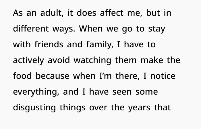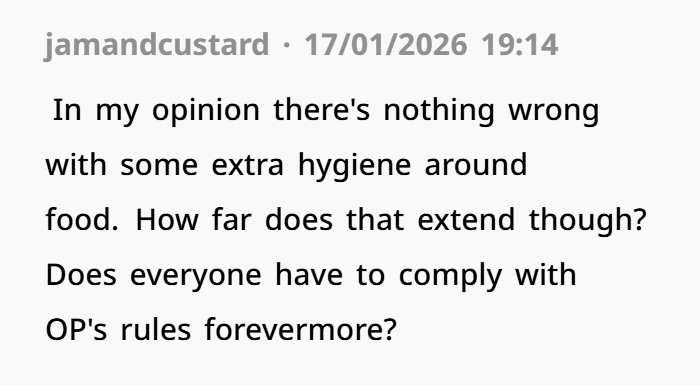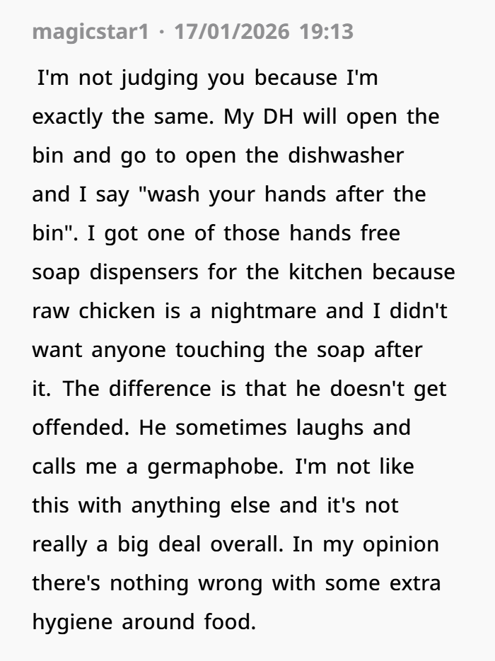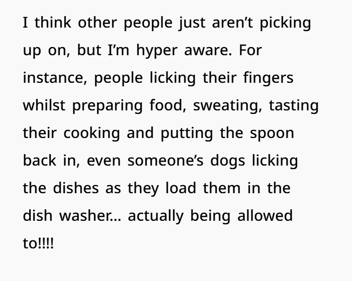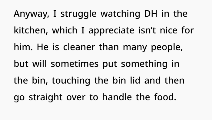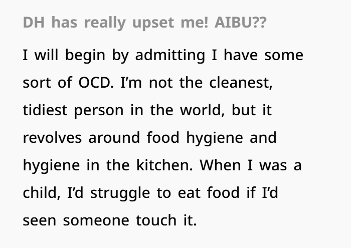 Let’s set the scene. The woman admits to having a form of OCD, mostly around food hygiene and cleanliness in the kitchen. Growing up, this issue was more extreme, but it still affects her daily life. For instance, she can’t bear to watch others prepare food because she notices things that, to her, are unhygienic—licking fingers while cooking, sweating while preparing food, or animals getting too involved in the kitchen. Her threshold for cleanliness is high, and even though her husband (DH) is cleaner than most, certain things still trigger her.