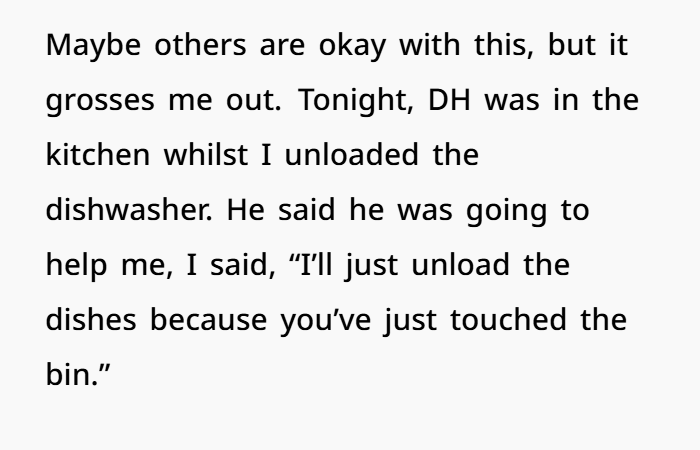 For example, tonight, as they were unloading the dishwasher together, her husband had touched the bin lid and then moved straight to handling food. To her, this is a big no-no. She explained her discomfort and said she’d handle the dishes herself, as he had just touched the bin, which for her is a hygiene issue. His response, however, wasn’t understanding. He got visibly upset, spoke angrily in front of their 11- and 12-year-old daughters, and even called her a “psychopath.”