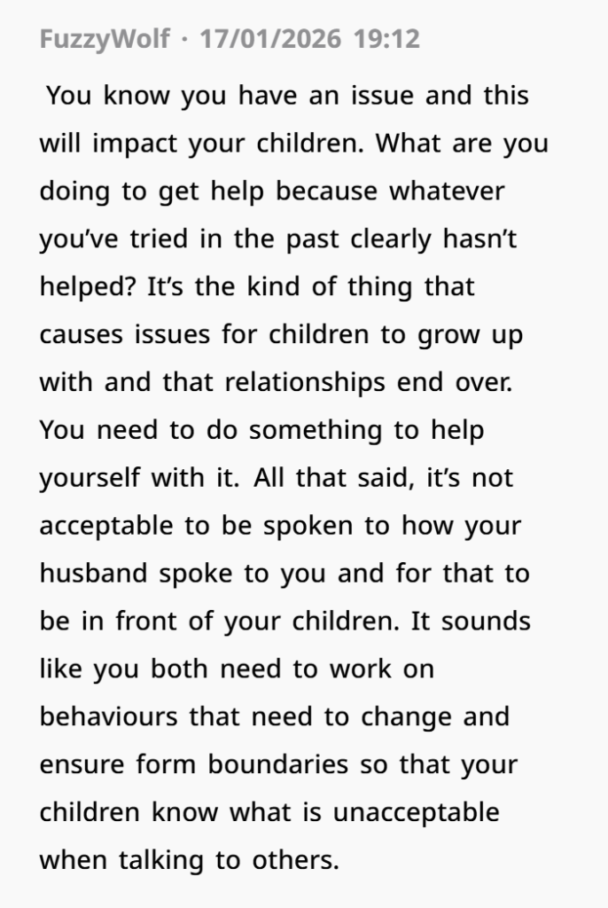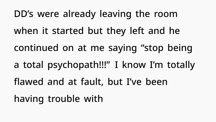 It’s easy to see how her husband might have felt frustrated or even confused by her reaction. He was just trying to help, and in his mind, her request could have seemed over the top. But his response, calling her a “psychopath” and continuing the argument in front of the kids, was completely inappropriate.