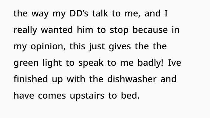 Feeling hurt, she tried to stop the argument, but it continued. This wasn’t just about food hygiene; it was about how he spoke to her and how his anger in front of their kids felt like it was undermining her authority in the household. She’s already struggling with how her daughters speak to her, and now, her husband’s reaction felt like a sign that it was okay for others to treat her disrespectfully. After the confrontation, she went upstairs to bed, feeling isolated and down after a tough day with the kids and her husband.