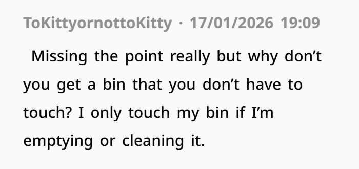 However, it’s also important to recognize that her husband might not fully understand the extent of her discomfort. For someone who doesn’t share the same sensitivity to cleanliness or hygiene, it can be hard to grasp why something as simple as touching the bin lid before handling food would trigger such a strong reaction. But that doesn’t mean her husband’s behavior was okay either. His response—yelling and calling her a “psychopath”—was hurtful and disrespectful, especially in front of their children.