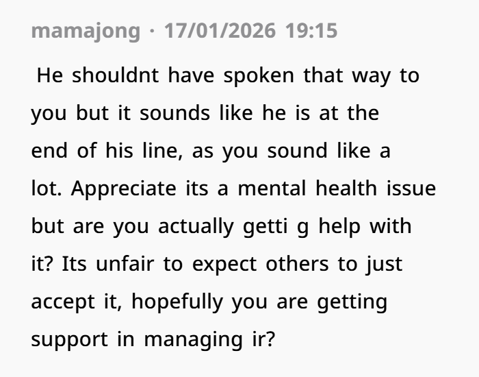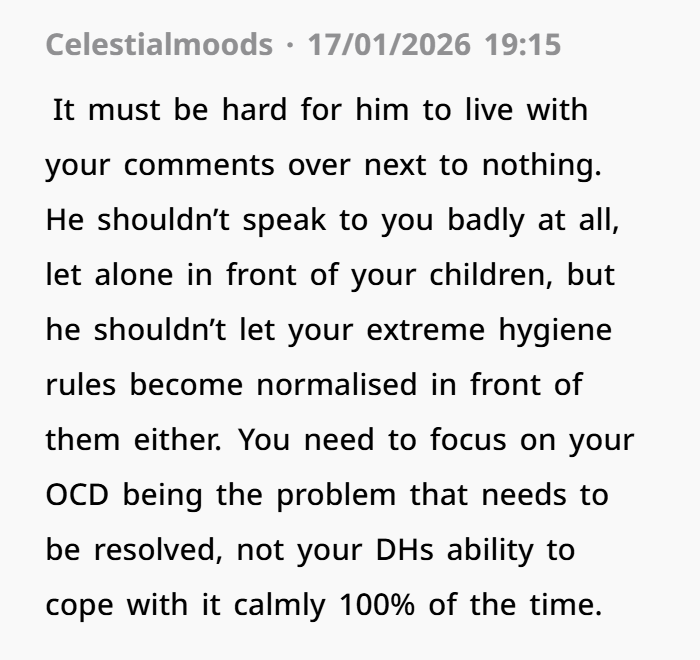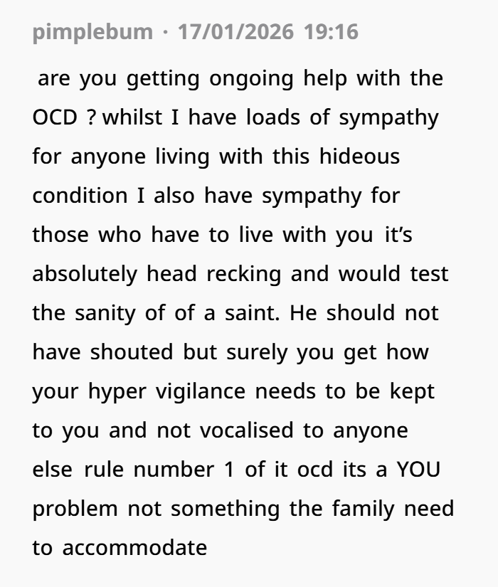 On the other hand, it’s also worth considering that her OCD can be challenging for those around her, and she may need to find ways to manage her anxiety without putting too much strain on her relationships. That said, that doesn’t excuse the way her husband spoke to her. It’s important to find a balance, and instead of criticizing her, he could have been more empathetic to her struggles. After all, living with OCD isn’t a choice, but how the people around her respond is.