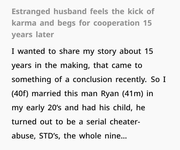 This story is wild, ironic, and honestly satisfying in all the ways you’d want a long-suffering single mom’s journey to end. OP, now 40, married a man in her early twenties who turned out to be a classic serial cheater. STDs, lies, gaslighting — and then full abandonment before their daughter was even two. He vanished into another state, ghosted all attempts at contact, and left her to raise their daughter alone.