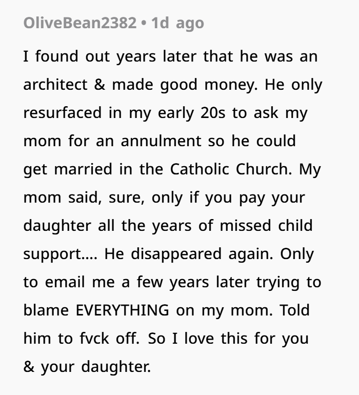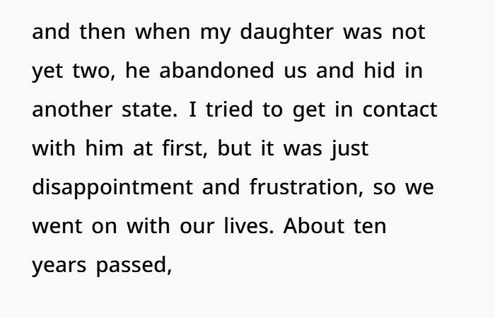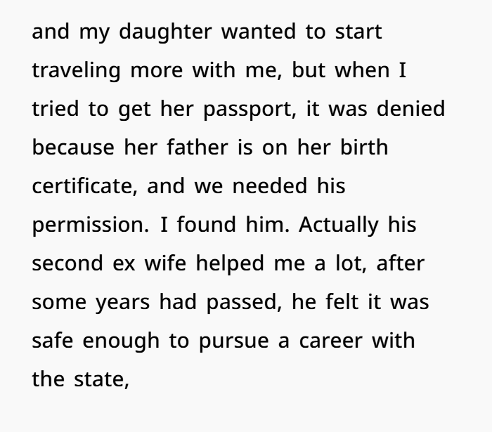 Fast forward ten years. OP’s daughter wants to start traveling, but the passport process brings back her estranged father’s name — and his signature is required. What followed was a decade-long saga of OP navigating red tape, tracking him down through his second ex-wife, and watching as karma caught up to a man who literally worked as a Child Protective Services agent while refusing to support his own child.