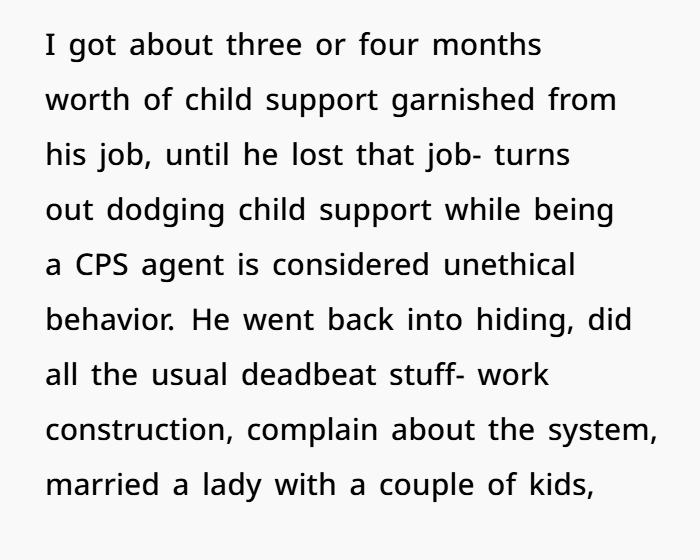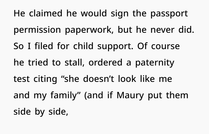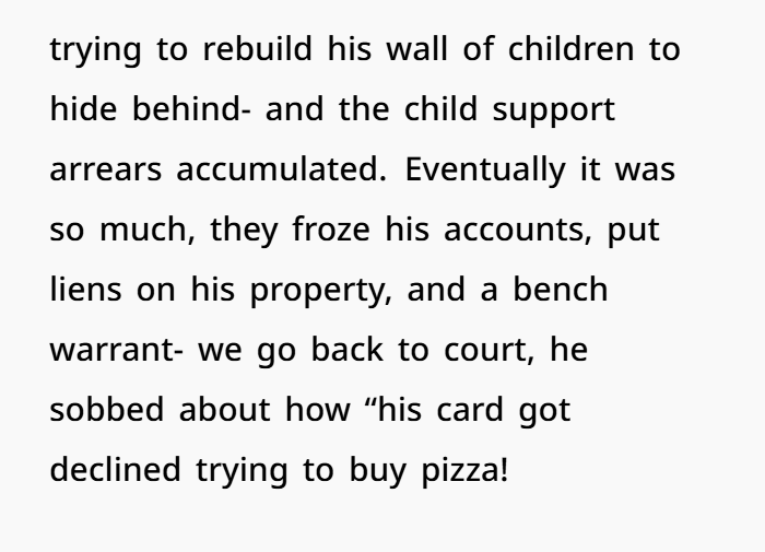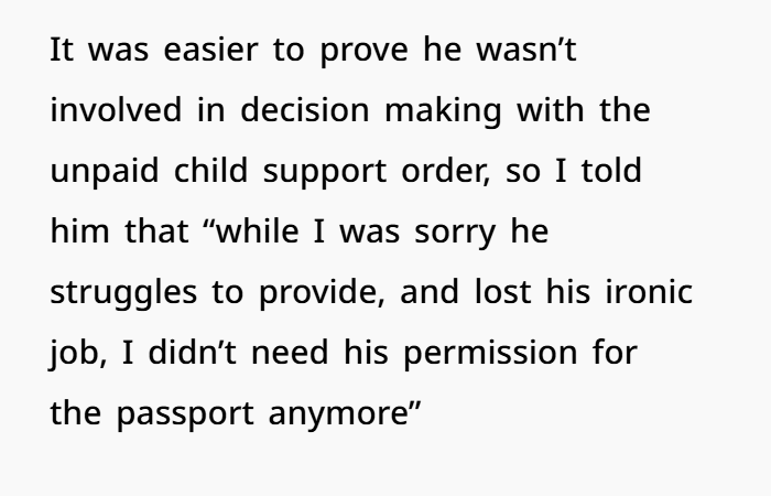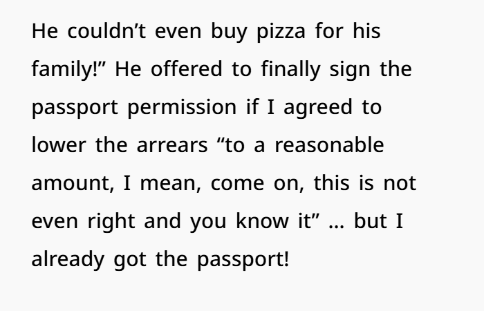 When the court finally caught up to him, he had to pay back child support. He threw tantrums, lost his cushy CPS job, and ended up deep in arrears with frozen bank accounts, liens on his property, and even a warrant. He begged to cooperate — not from remorse, but because his pizza card got declined. OP, meanwhile, had already secured the passport through legal workarounds — and she wasn’t in the mood to let him off the hook. Classic case of deadbeat dad meets poetic justice.