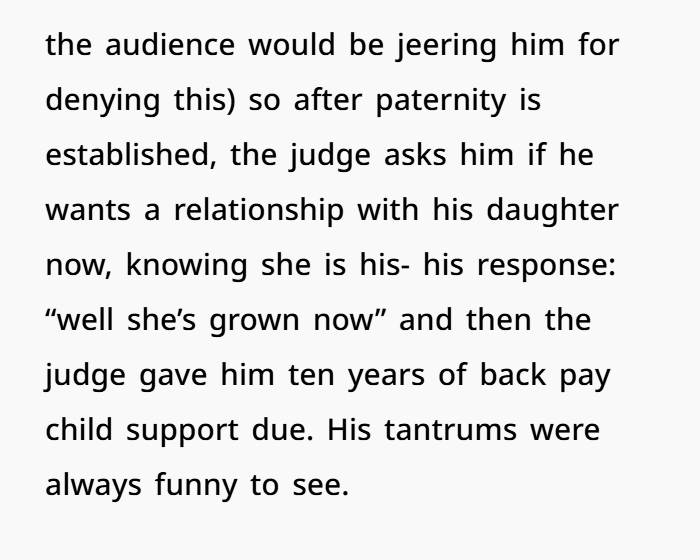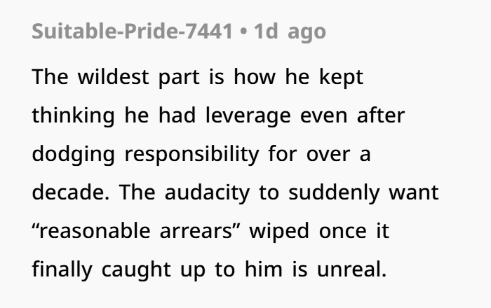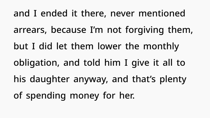 And she didn’t even mention the arrears. She let the courts keep chasing him. But she did reduce the monthly amount — not for his comfort, but to make sure her daughter got regular payments she could enjoy. That’s what being a good parent looks like. She put her kid first. He never did.