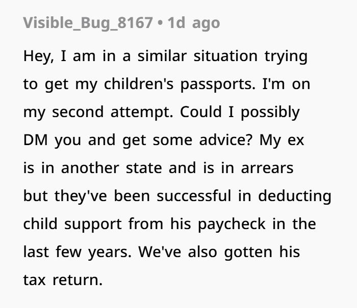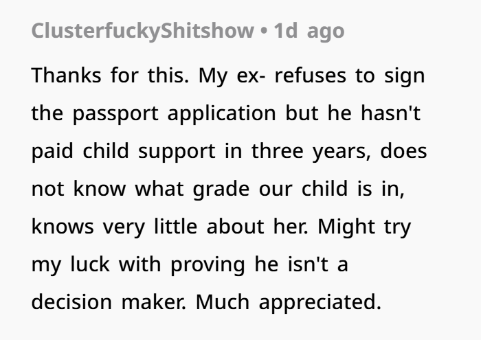 Luckily, there are legal workarounds. With enough documentation of a parent’s absence or lack of involvement, courts can approve sole legal decision-making or override the passport requirement — especially if back child support proves a pattern of disengagement. And that’s what OP ended up using. (Keyword: how to get child passport without other parent’s consent)